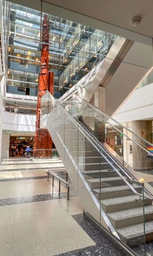 Structural design for a 6-storey partial infill of an existing atrium to accommodate four new glazed elevators, expanded mechanical spaces, and HVAC upgrades. Work included revised framing for a new escalator pit, relocation of stairs and escalator, and column cladding. We issued revised, stamped structural drawings and developed a layout strategy to increase rentable space, improve flow, and enhance natural light for a modern, open interior.