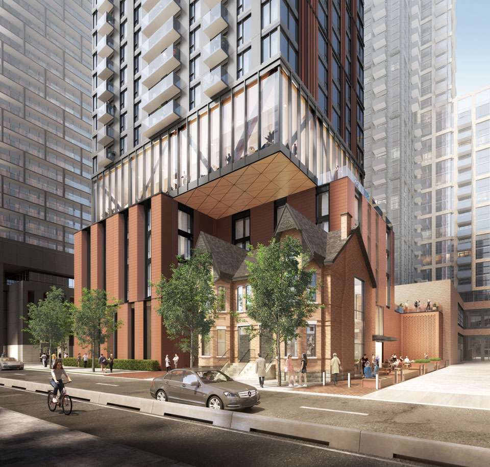 Located in the heart of Toronto’s bustling Entertainment District, 128 Peter is a 39-storey condominium tower designed in dialogue with the surrounding brick and beam warehouse context in a sensitive juxtaposition between old and new. The tower features dramatic cantilevers sheltering Victorian houses that sit on the site which will be respectfully restored.